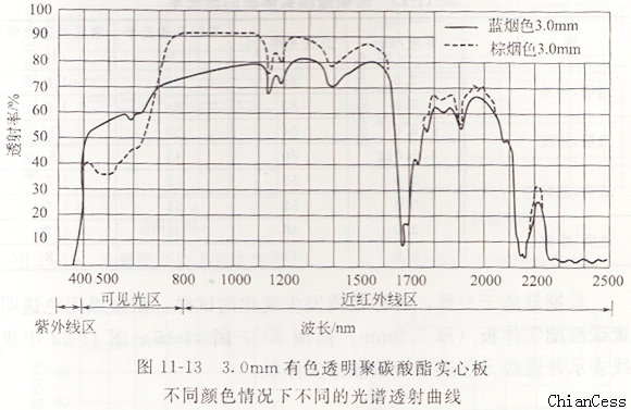 聚碳酸酯耐力板在室溫下的折射率是1.585,圖11-11表明無(wú)色透明聚碳酸酯實(shí)心板不同厚度的光譜透射曲線。板材厚為1.0mm、2.0mm、3.0mm、5.0 mm、6.0mm、8.0mm、10.0mm。圖11-12是3.0mm無(wú)色透明聚碳酸酯實(shí)心板光滑板和壓紋板的不同光譜透射曲線。圖11-13是3.0mm有色透明聚碳酸酯實(shí)心板不同顏色情況下不同的光譜透射曲線。